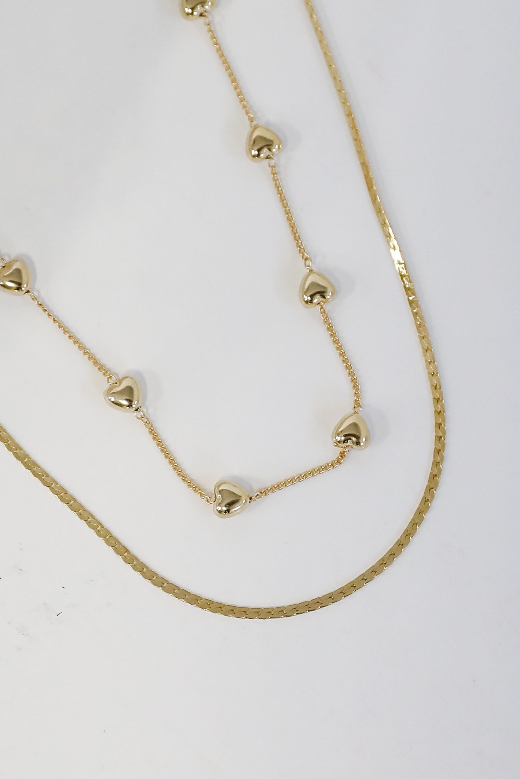 Showcase your sweeter side when you wear the Aria Gold Heart Layered Chain Necklace! This trendy necklace features two layers of gold chains with hearts. Style the Aria Necklace with any outfit to instantly upgrade your look! Gold Plated Layered Hearts Lobster Clasp with ExtenderLayer 1 | Length 7″Layer 2 | Length 6.5″Extender | Length 3″